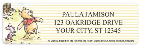 The matching address labels feature the same six Winnie the Pooh and Friends designs shown in the check series, each highlighting a different character moment from the Hundred Acre Wood. The Winnie the Pooh labels can be added when ordering the checks, or purchased on its own by clicking the image above.