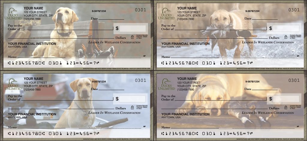 This Ducks Unlimited check design features four photographic scenes highlighting retrievers in outdoor settings associated with waterfowl country. The imagery reflects moments of focus and calm, from dogs resting along the water’s edge to attentive poses that feel right at home in wetland and grassland environments. Each design includes the Ducks Unlimited logo positioned near your personal information.