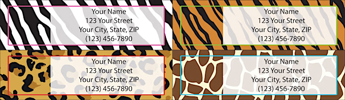 Matching Fashion Safari address labels are available and feature the same bold animal-print patterns shown on the checks above. The designs coordinate with the zebra, cheetah, giraffe, and bengal tiger prints, making them a stylish companion for everyday mail.