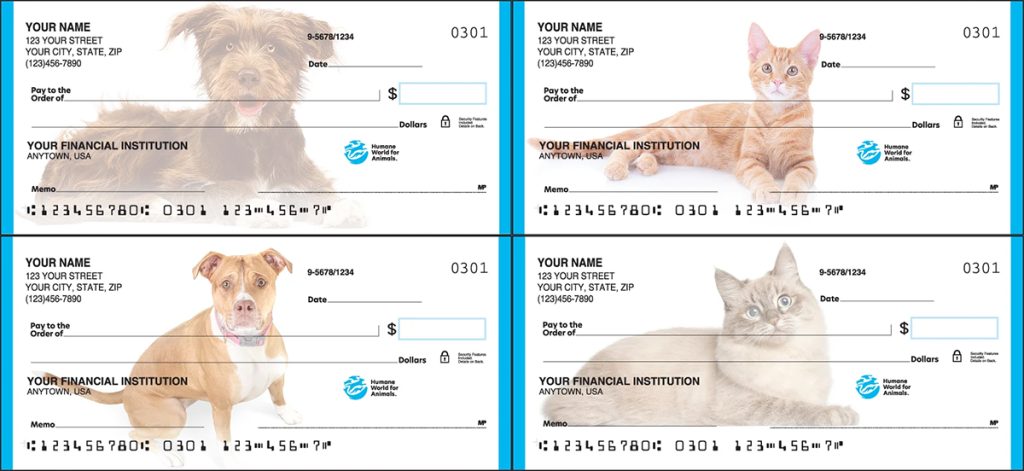 These earlier check designs featured the Humane Society of the United States name and logo, along with imagery highlighting animals in need of care and protection. This series is no longer available and is shown here for reference only, following the organization’s rebrand to Humane World for Animals.