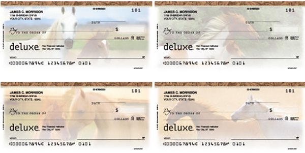 Untamed Spirit checks showcase horses in quiet, natural moments that feel both powerful and peaceful. The designs capture the freedom and presence of horses in open landscapes, featuring softly rendered portraits and profile views set against wide, airy backdrops. Warm, earthy tones and subtle motion blur suggest movement and open space without overpowering the artwork itself.